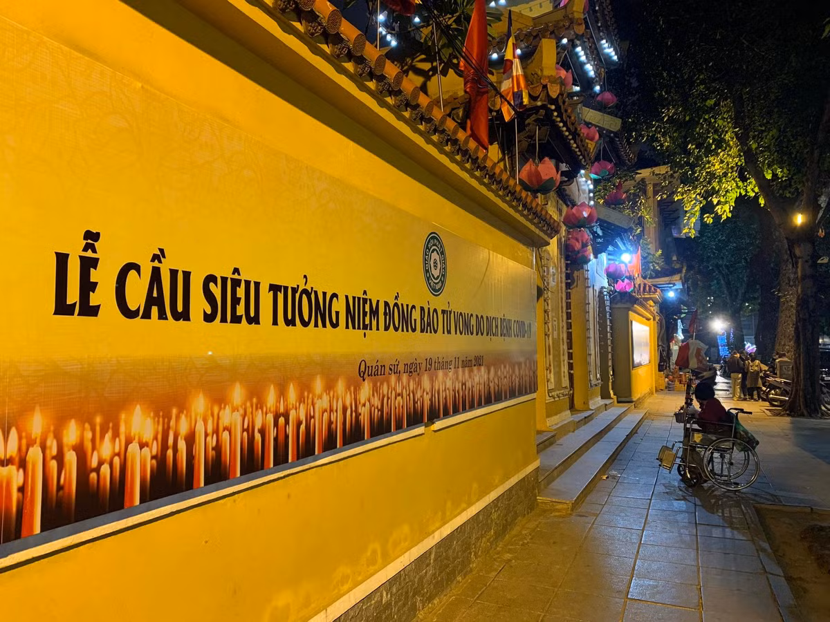 Khoảng 20h15, hàng trăm phật tử tại chùa Quán Sứ cũng đã bắt đầu làm làm lễ cầu nguyện đồng bào và cán bộ, chiến sỹ hy sinh, tử vong trong đại dịch Covid-19