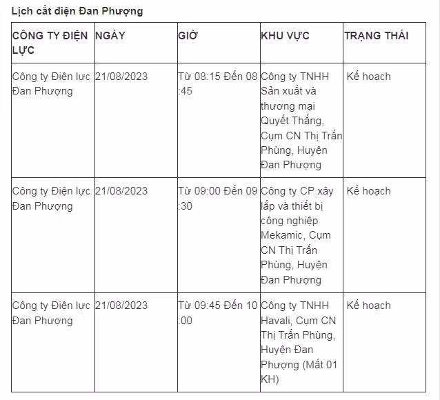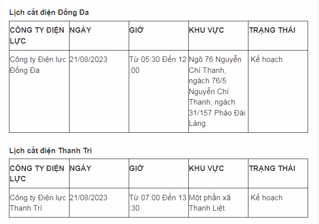 Lịch cắt điện Hà Nội hôm nay mới nhất theo từng khu vực được cập nhật từ cổng thông tin Tổng Công ty Điện lực Hà Nội ngày 21/8/2023.
