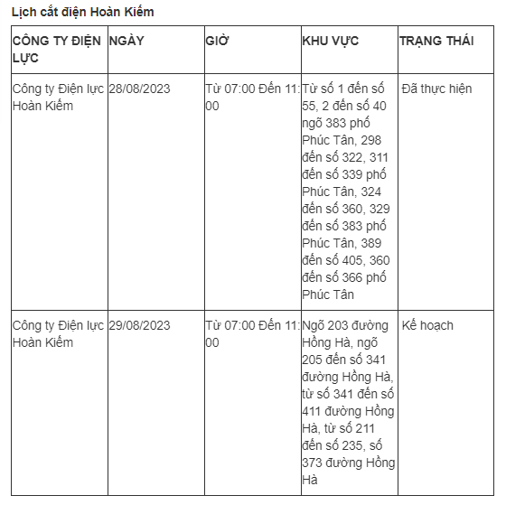Ngày 29/8, EVNHANOI sẽ có kế hoạch tạm ngừng cấp điện một số quận, huyện. Trong đó có quận Hoàn Kiếm, Đống Đa, Đông Anh, Sóc Sơn, Thanh Xuân, Long Biên, Thạch Thất, Đan Phượng, Bắc Từ Liêm…