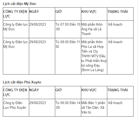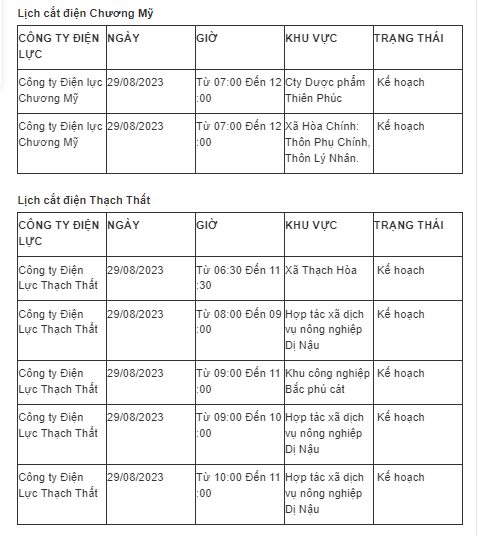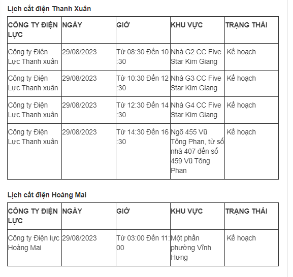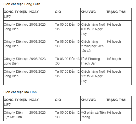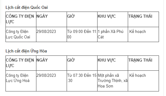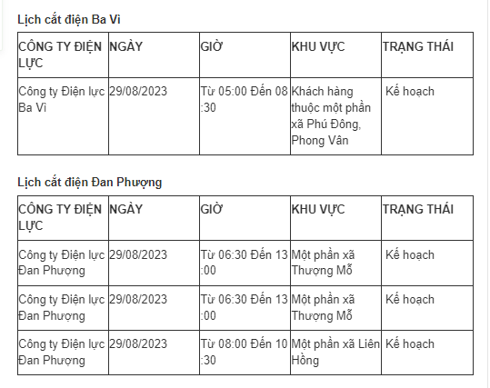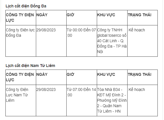 Theo lịch cắt điện ngày 29/8 của Tổng Công ty Điện lực TP. Hà Nội (EVNHANOI), sẽ có nhiều quận, huyện nằm trong kế hoạch ngừng cung cấp điện vào ngày mai.