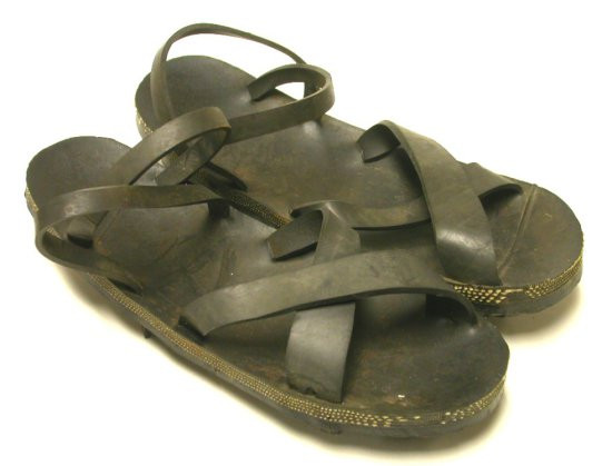 Trên thế giới, dép lốp (tire sandals) là tên gọi chung của các loại giày dép đơn giản được làm từ săm và lốp xe bỏ đi. Loại dép này dễ làm, rẻ tiền lại rất bền. Nhưng chỉ tại Việt Nam, dép lốp mới trở thành một "huyền thoại" lịch sử. Ảnh: Vietnamnet.