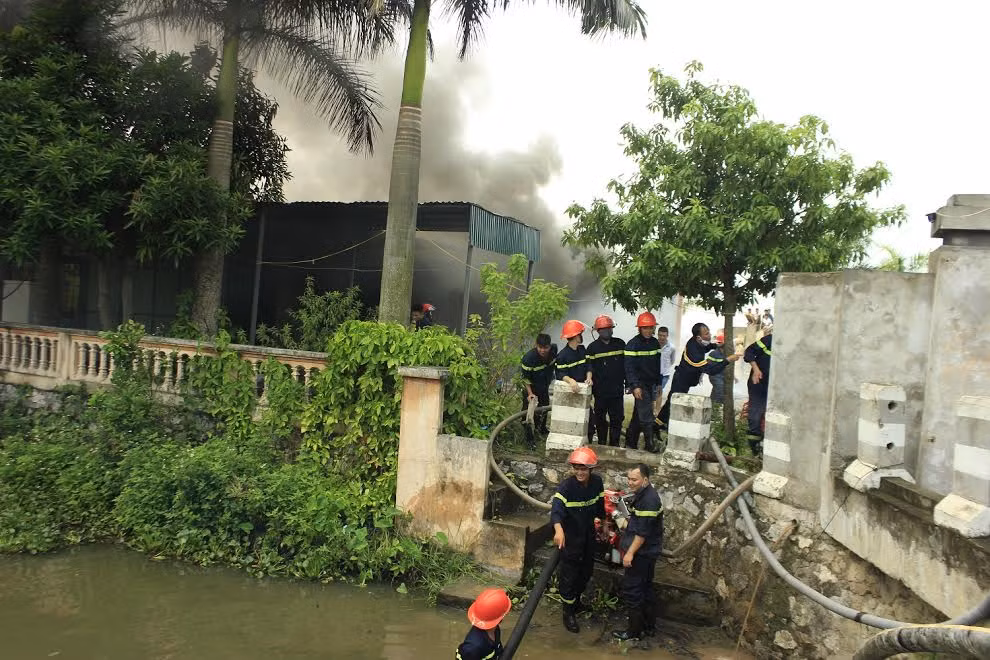 Do nước chữa cháy không đủ nên lính cứu hỏa đã phải sục ống xuống mương nước cạnh đó để lấy nước chữa cháy.
