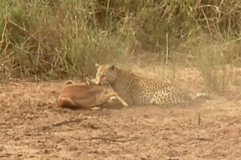 Thấy bầy linh dương Impala đang uống nước bên bờ hồ, báo hoa mai đã lao ra tấn công. Với tốc độ, sức mạnh cùng kỹ năng săn mồi tuyệt đỉnh, nó đã dễ dàng tóm gọn 1 con linh dương.