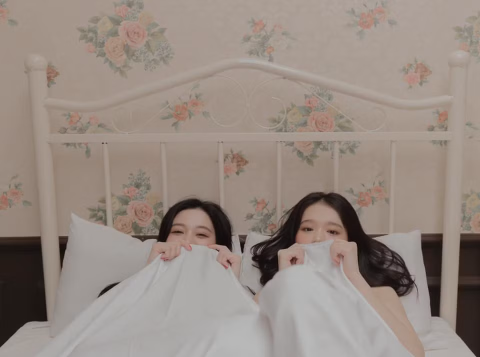 Trong bộ ảnh mới nhất, cặp đôi hot girl Linh Ka và Jun Vũ diện áo hai dây, short ngủ theo concept "song sinh".