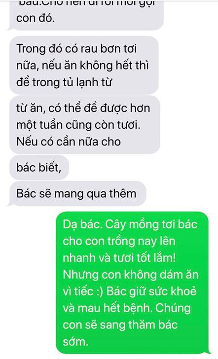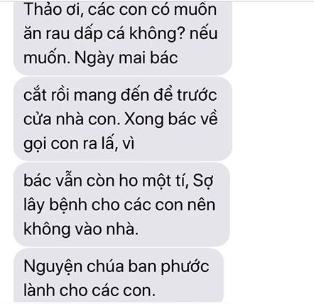 Mẹ chồng tương lai của Thanh Thảo không khắt khe mà rất thoải mái và quan tâm đến nữ ca sĩ từ những điều nhỏ nhất. Đoạn tin nhắn qua lại giữa Thanh Thảo và mẹ chồng tương lai dưới đây đã hé lộ điều đó. Mẹ của bạn trai nhắn tin muốn cho Thanh Thảo rau sạch tự trồng. Khi đem rau đến nơi, mẹ chồng tương lai của Thanh Thảo đặt ngoài cửa rồi về luôn, tránh gặp mặt vì bà đang bị cúm nên không muốn lây cho Thanh Thảo và các cháu nhỏ ở nhà.