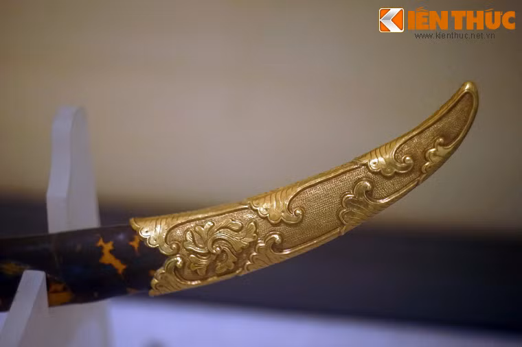 Cây bảo kiếm trăm tuổi được chế tác rất tinh xảo. Nhiều bộ phận dát vàng, nạm ngọc quý.