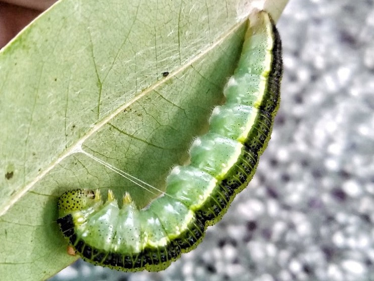Sâu muồng sau khi trưởng thành sẽ bám xuống dưới chiếc lá, nhả tơ và hóa thành nhộng. (Ảnh: Hoàng Đức Độ).