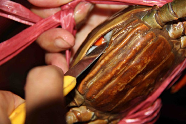 Theo anh Phong, để kiểm tra xem có đúng là cua gạch son hay không, có thể dùng tay đè nhẹ lên phần giữa mai cua và yếm cua, sau đó nhìn vào để xem. Nếu cua gạch nhiều sẽ thấy phần gạch màu đỏ bên trong. Ngược lại, nếu không thấy gì hoặc chỉ thấy gạch màu vàng ở sâu bên trong là không phải.