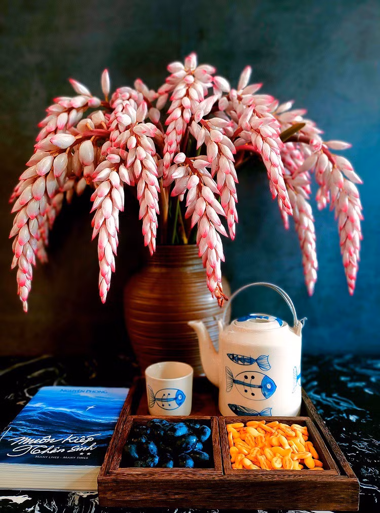 Bình hoa nhìn như những bông lúa "siêu to" màu phớt hồng đặc biệt. (Ảnh: Cherry Ly).