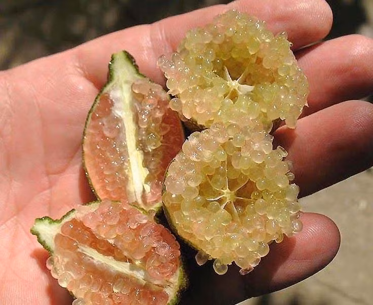 Chanh ngón tay có tên khoa học là Citrus australasica, thuộc họ cam chanh và có nguồn gốc bản địa từ nước Úc. Với hình dáng thuôn dài như ngón tay, kích thước khoảng 5–10cm, vỏ mỏng, loại chanh này có thể mang nhiều màu sắc khác nhau: xanh, đỏ, vàng, nâu, cam… Khi cắt đôi, bên trong lộ ra những hạt nhỏ hình cầu mọng nước, lấp lánh như trứng cá hồi – điểm khiến nhiều người mê mẩn ngay từ cái nhìn đầu tiên.