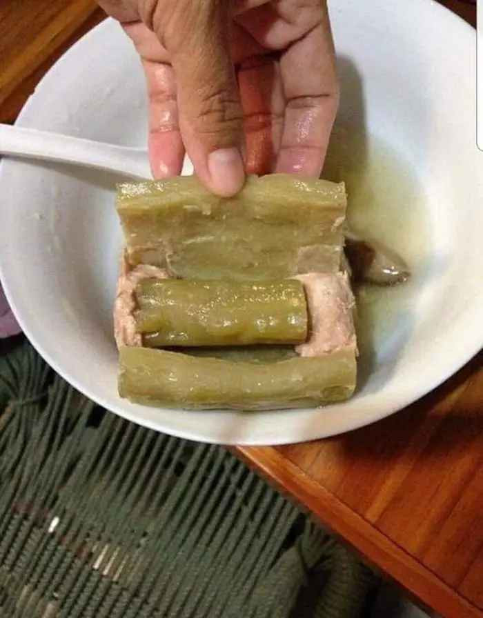Hình ảnh chiếc bánh tét sau khi bóc ra, cô gái này đã ''sốc'' vì 2 chiếc bánh từ trong ra ngoài chỉ có 1 màu trắng đục của gạo nếp, còn nhân đỗ thịt ở đâu thì không ai biết.