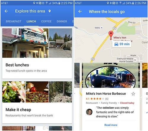 Sau nhiều năm phát triển, Google Maps đã có một dữ liệu lớn các đề xuất nhà hàng hoặc địa điểm tham quan. Chỉ cần chạm vào tùy chọn Explore từ trình đơn trượt ra ngoài, bạn sẽ được trình bày với nhiều lựa chọn khác nhau cho những gì ở gần khu vực bạn đứng.