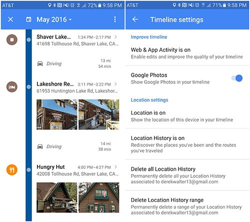 Nếu sử dụng Google Photos, Maps cũng sẽ hiển thị hình ảnh mà bạn chụp ở một vị trí cụ thể. Nhờ vậy bạn có thể tìm kiếm một bức ảnh chụp tại một địa điểm nào đó mọt cách nhanh chóng. Nhưng nếu muốn xóa bỏ điều này, bạn có thể tìm đến Timeline settings và xóa lịch sử hoặc tắt tính năng này đi.