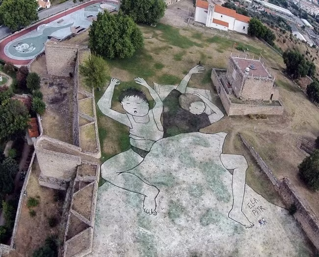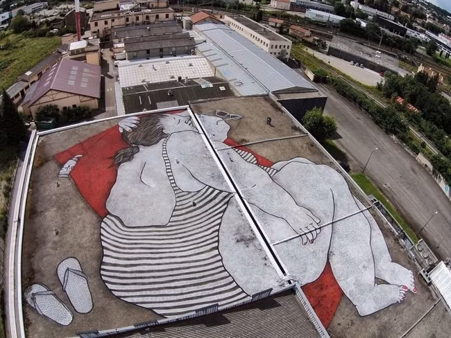 Ella và Pitr, đến từ Saint-Etienne, Pháp đã tạo ra các bức tranh đường phố minh họa các nhân vật đang ngủ giống như người khổng lồ đang say giấc.