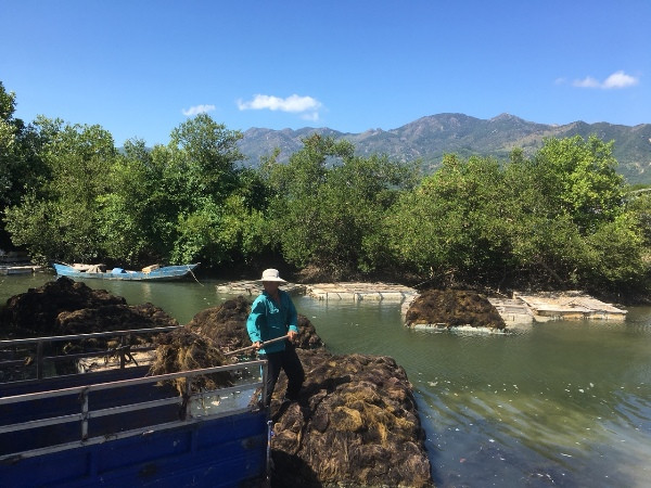 Anh Hoàng Văn Mỹ (thôn Bắc Vĩnh, xã Cam Hải Tây, Cam Lâm) cho biết: “Gia đình tôi làm nghề làm rau câu chỉ hơn 15 năm nay. Khi lấy rau phải phụ thuộc theo con nước, cứ sáng sớm ra biển vớt rau câu chỉ biển, đến khoảng 12h trưa di chuyển vào bờ. Gia đình tôi làm 2 người, trung bình khoảng 2 tạ khô/ngày, với giá bán 3.500 đồng/kg khô, gia đình thu nhập 700.000 đồng”.