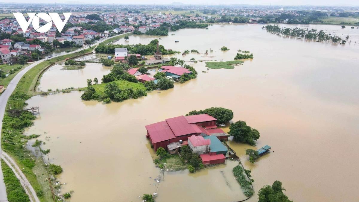 Nước sông Cầu dâng cao ở mức báo động 2, khiến hàng trăm hộ dân ở các xã Hợp Thịnh, Xuân Cẩm, Mai Đình (huyện Hiệp Hòa, tỉnh Bắc Giang) bị ngập sâu.