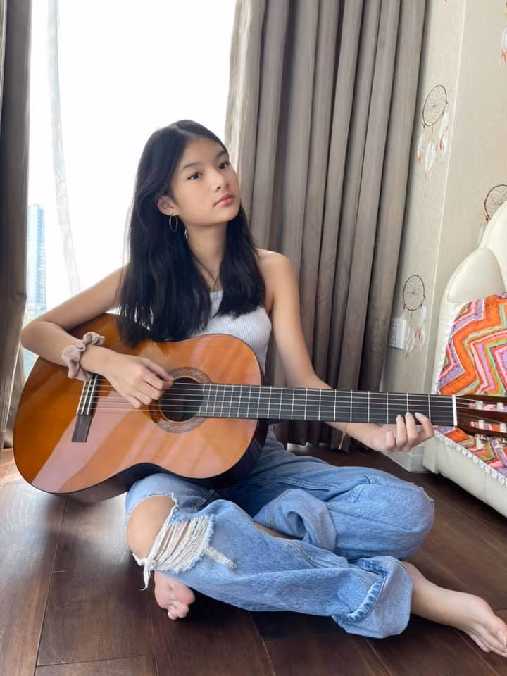 Bé Bảo Tiên - con gái Trần Bảo Sơn và Trương Ngọc Ánh tập guitar.