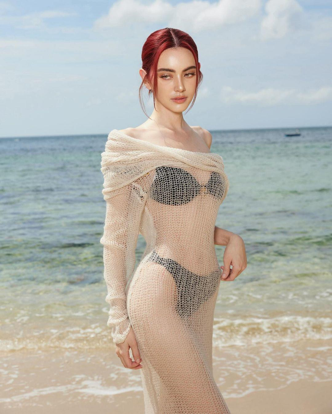 Mai Davika vô cùng quyến rũ khi phối váy lưới bên ngoài bikini đi biển.