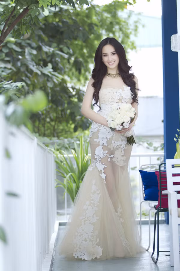 Mai Phương Thúy mặc váy cưới xuyên thấu
