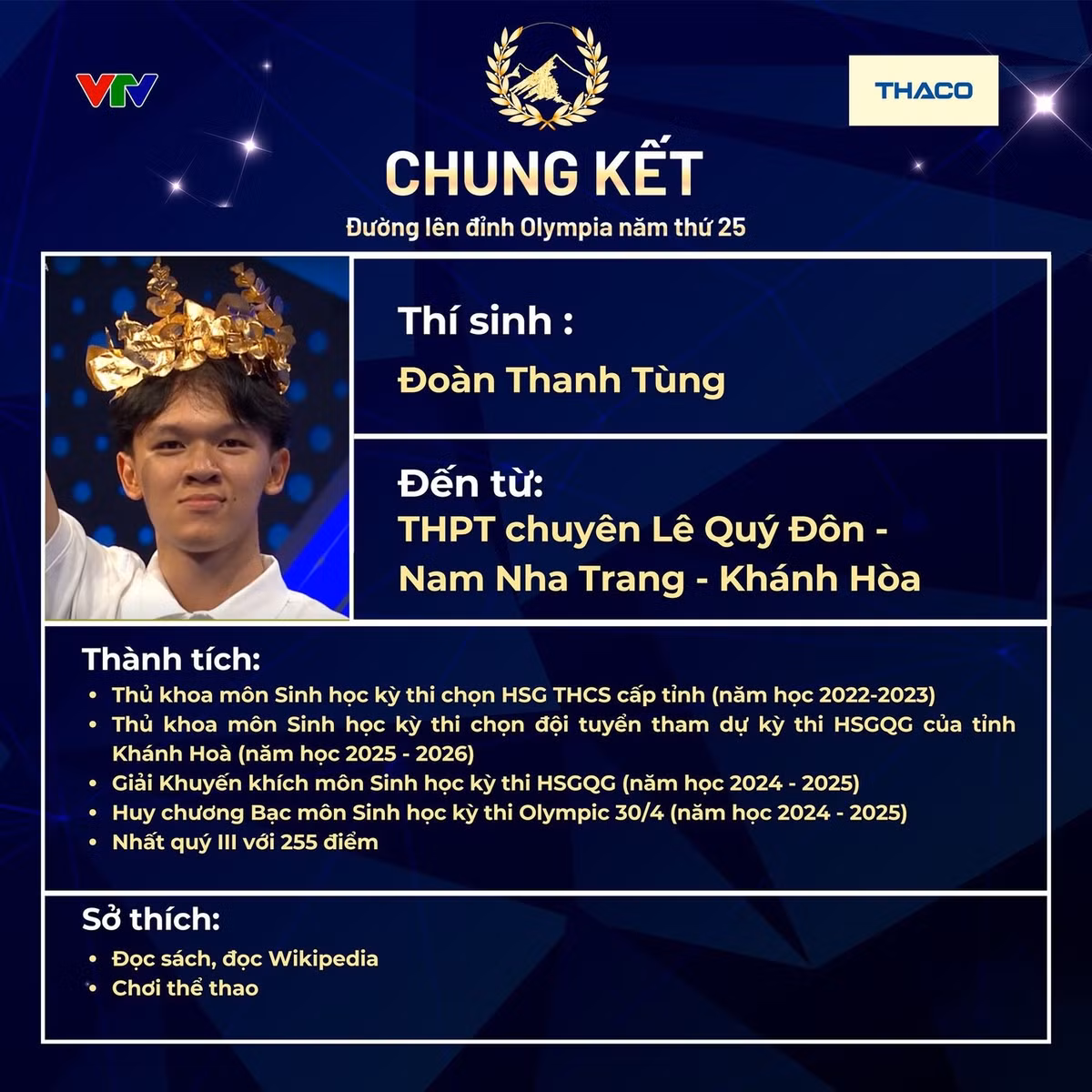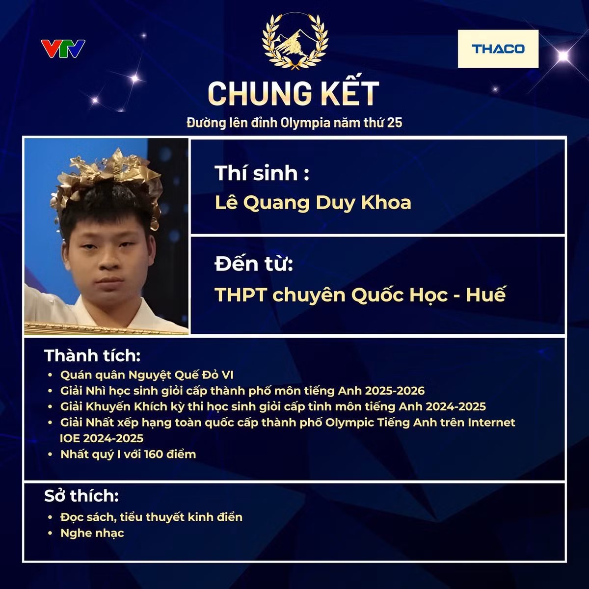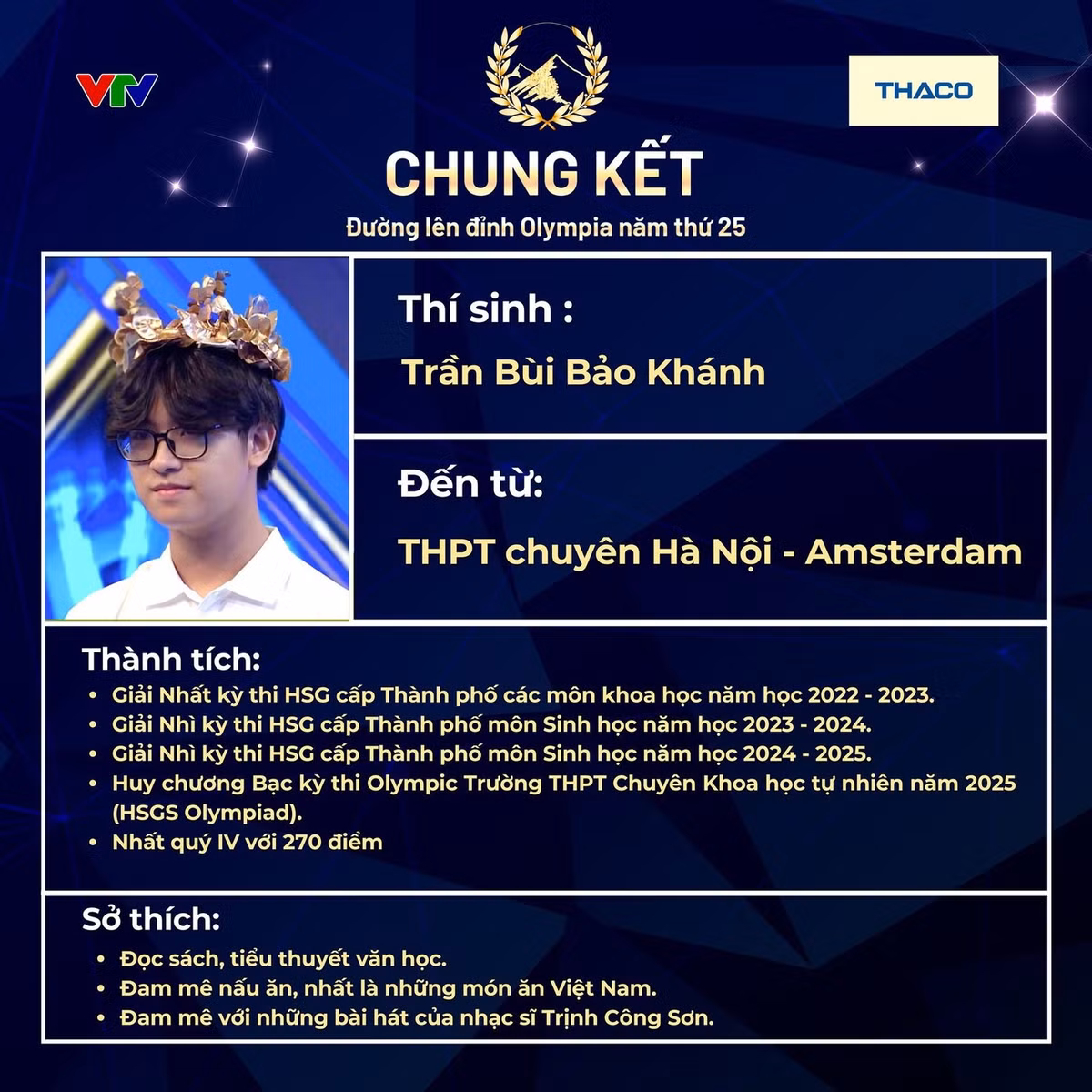 Sáng 26/10 diễn ra Chung kết năm Đường lên đỉnh Olympia năm thứ 25. Bốn gương mặt xuất sắc nhất tranh tài trong trận chung kết là: Lê Quang Duy Khoa (THPT chuyên Quốc Học - Huế, thành phố Huế), Nguyễn Nhựt Lam (THPT Cái Bè, tỉnh Đồng Tháp), Đoàn Thanh Tùng (THPT chuyên Lê Quý Đôn - Nam Nha Trang, tỉnh Khánh Hòa) và Trần Bùi Bảo Khánh (THPT chuyên Hà Nội – Amsterdam, thành phố Hà Nội).