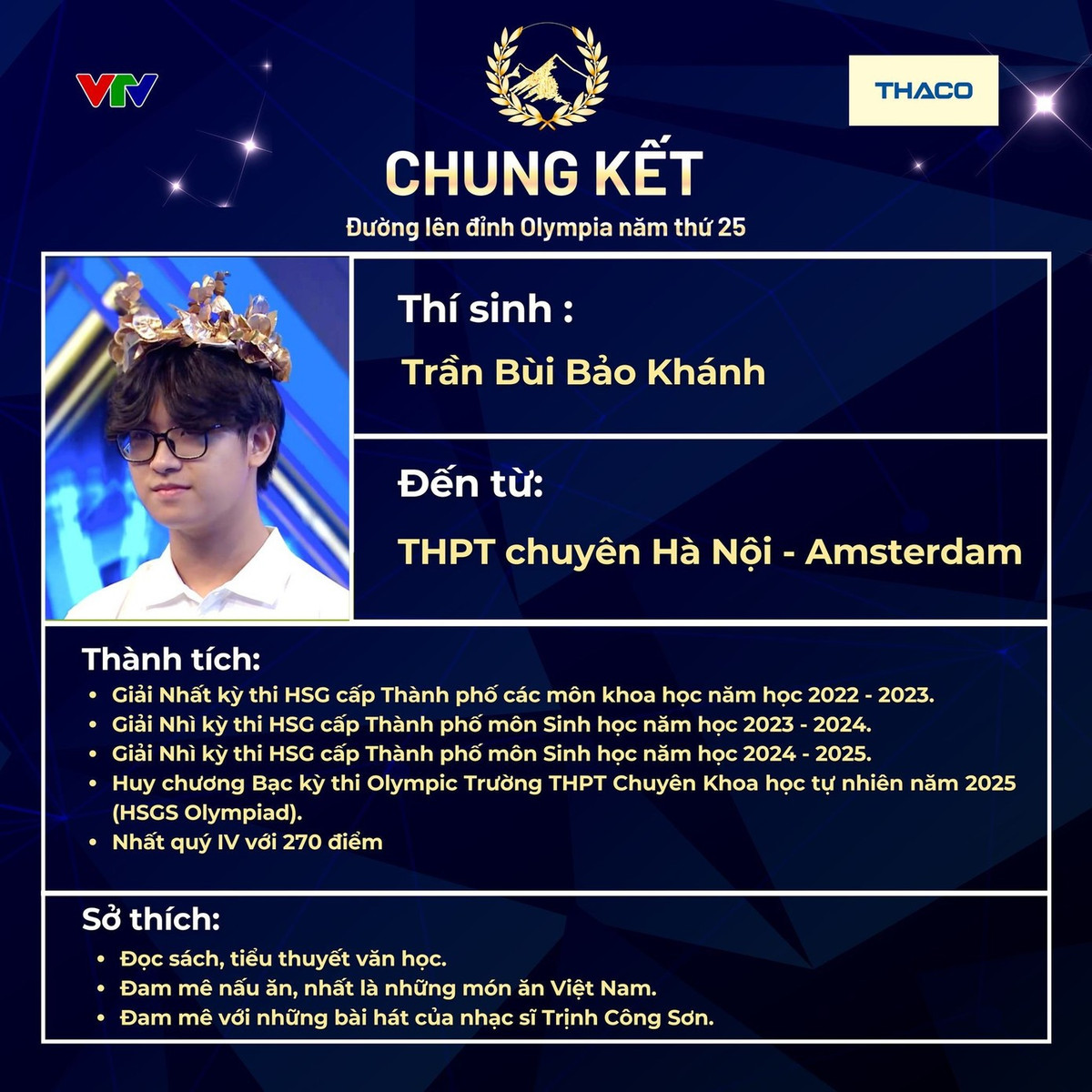 Trên hành trình chinh phục chức vô địch Đường lên đỉnh Olympia 25, Bảo Khánh không chỉ mang theo ước mơ của bản thân mà còn là cách để phát huy truyền thống hiếu học. “Chức Vô địch thứ hai của Thủ đô, hãy đợi tôi nhé”, Bảo Khánh bày tỏ.