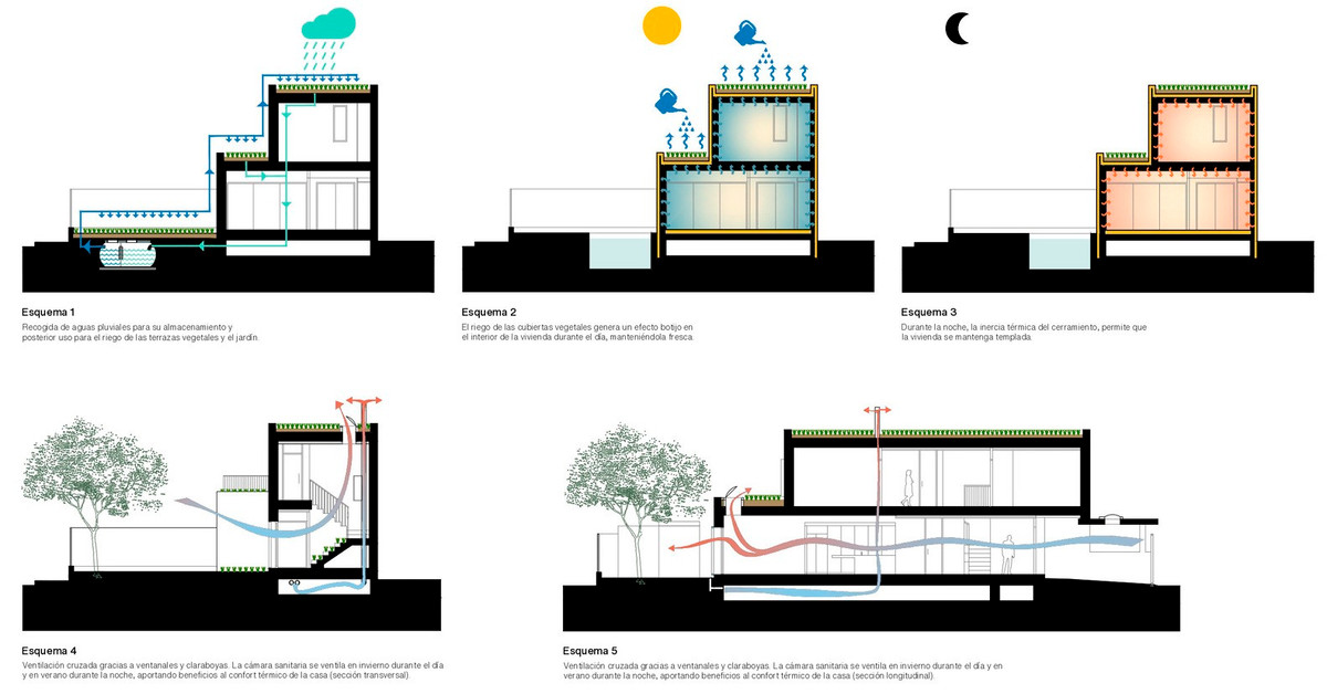 Để giảm nhiệt cho ngôi nhà vào mùa hè, KTS ứng dụng “Hiệu ứng bình đất nung” bằng cách lấy nước mưa từ mái nhà, tưới nhỏ giọt lên sân thượng.