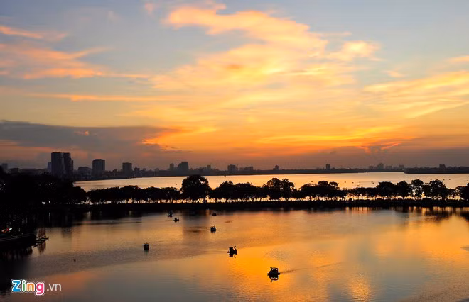 Mặt nước mênh mang đón những vạt nắng chiều dịu nhẹ từ phía hồ Tây xuyên qua những tán lá in bóng trên đường.