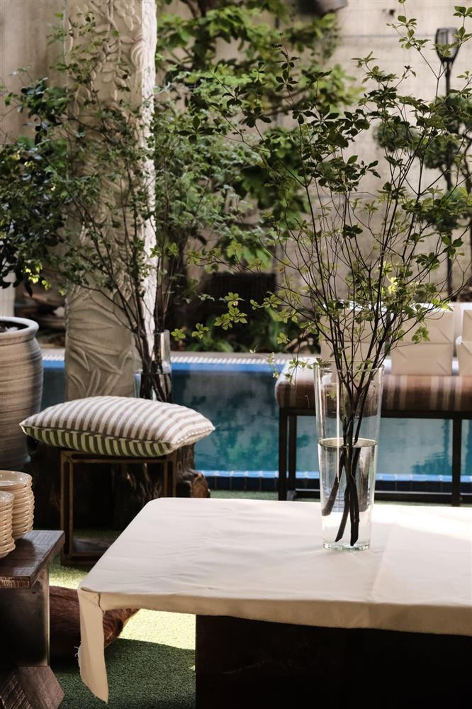 Bóng bay và những cành cây xanh tươi được bố trí tinh tế trên những bàn tiệc.