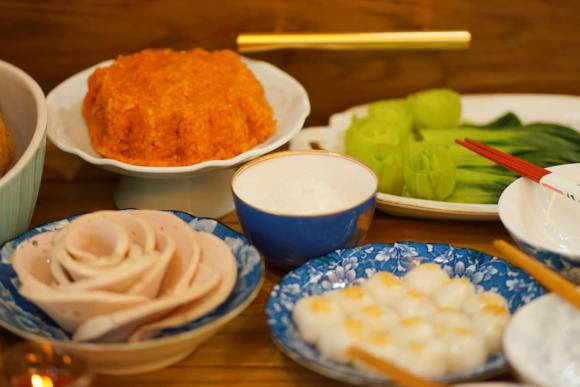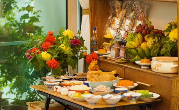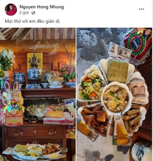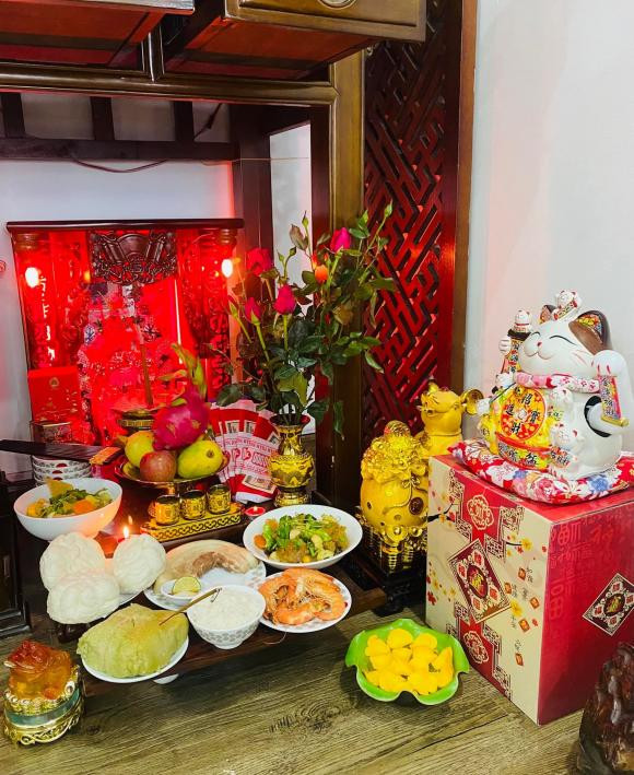 Diễn viên Thu Nga được khen đảm đang khi chuẩn bị mâm cỗ cúng ông Công ông Táo vào 23/12 âm lịch đầy đủ với nhiều món như gà luộc, xôi gấc, giò, nem rán, rau luộc...