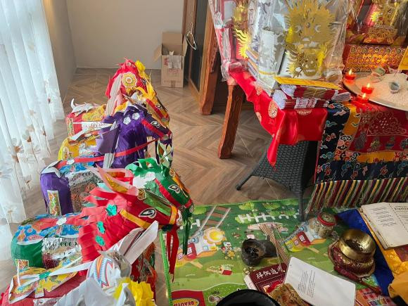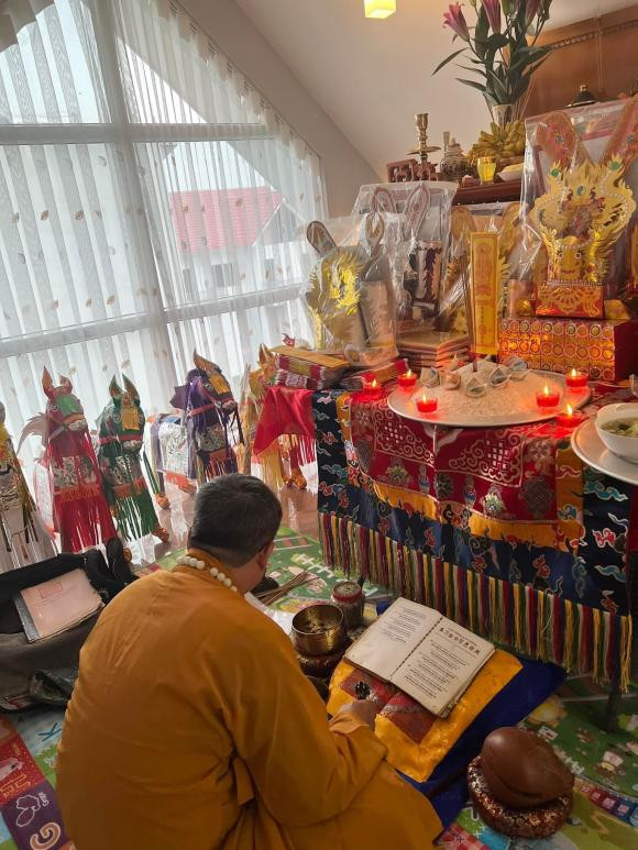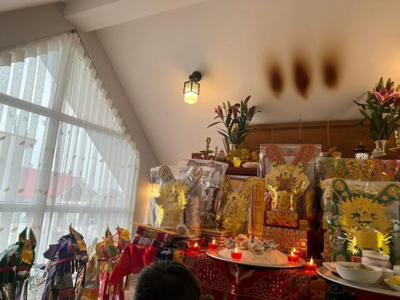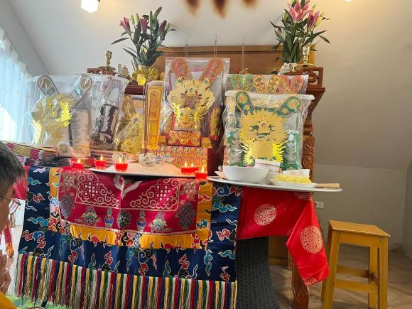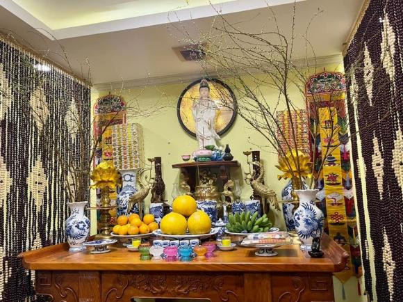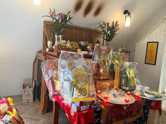 Gia đình ca sĩ Ngọc Anh làm lễ cúng ông Công ông Táo vào 21/12 âm lịch. Nữ ca sĩ còn mời sư thầy về nhà làm lễ.