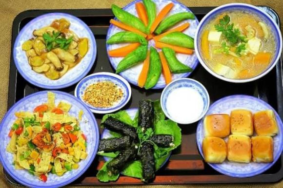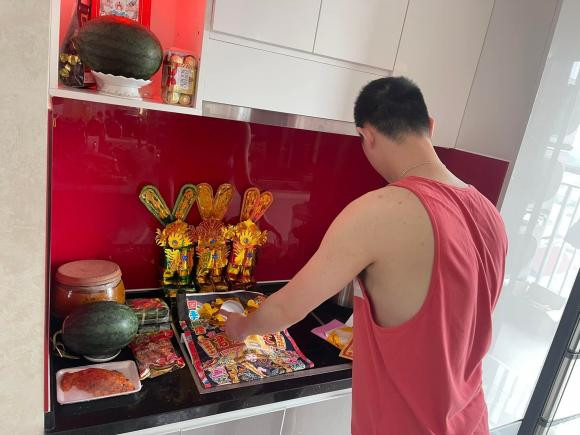 Vợ của nghệ sĩ Tự Long làm cúng ông Công ông Táo từ 20/12 âm lịch. Mâm cỗ cúng bao gồm xôi gấc, rau củ luộc, nem rán, canh....