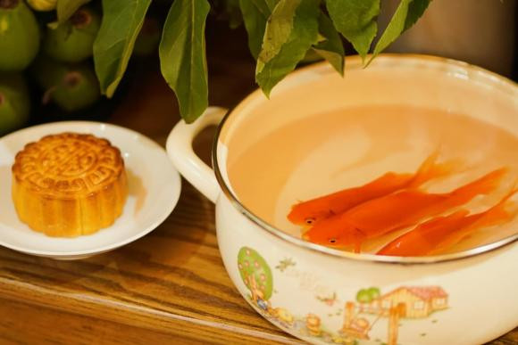 Do giúp việc nghỉ làm sớm nên Trang Trần được ông xã phụ làm lễ cúng ông Công ông Táo. Mâm cỗ cúng của gia đình Trang Trần gồm xôi gấc hình cá, bánh chưng, dưa hấu, kẹo.