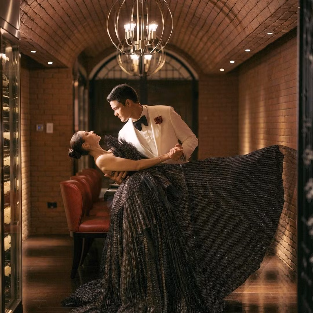 Marian Rivera và chồng trao cho nhau nụ hôn ngọt ngào. Hai diễn viên đã bên nhau 11 năm, có hai nhóc tỳ Zia và Sixto, nhưng vẫn giữ được tình cảm mặn nồng như khi mới yêu. Họ được gọi là nhà vua và nữ hoàng của buổi tiệc.