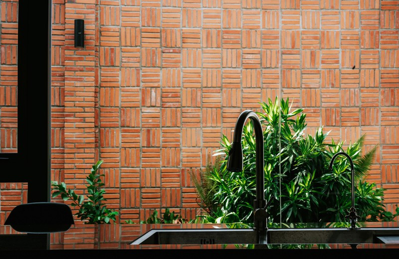 Mặt tiền được tách thành hai lớp gạch đất nung, xen kẽ cửa chính và sảnh đệm.