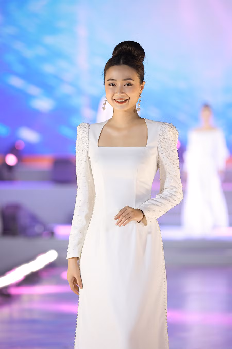 Với vị trí vedette, MC Mai Ngọc được giao mặc bộ áo dài cách điệu với phần vai trần và những hạt ngọc trai đính kết tinh tế. Ngoài ra, thiết kế còn có thêm áo choàng và chiếc trâm cài tóc tạo khiến Mai Ngọc lộng lẫy và đài các. Cô nhận được nhiều tràng vỗ tay cổ vũ với phong cách diễn cuốn hút khi đã lâu mới trở lại trình diễn thời trang