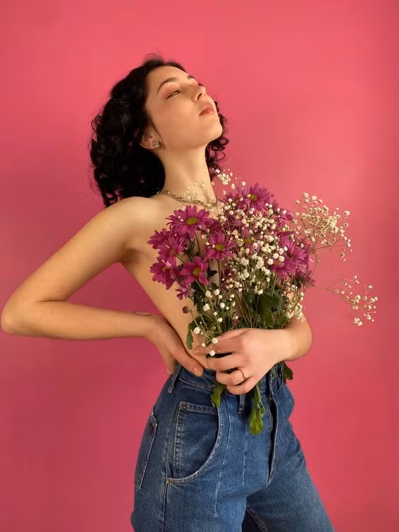 Bên cạnh đó, giới trẻ còn yêu thích việc lấy hoa tươi làm áo và thực hiện những bộ ảnh nghệ thuật. Thông thường, các cô gái sẽ phối hoa với quần jean cạp cao bởi nó ôm vừa vặn sẽ giữ được hoa đồng thời cân bằng khoảng hở.