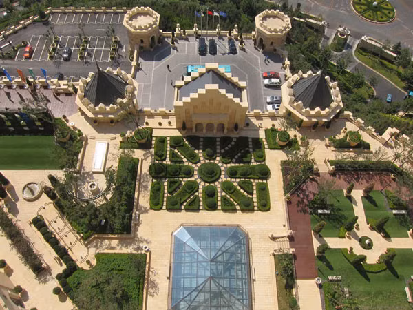 Khu vườn nhỏ bên dưới được cắt tỉa cẩn thận, các đài phun nước xinh đẹp tạo thành khuôn viên đẹp mắt.
