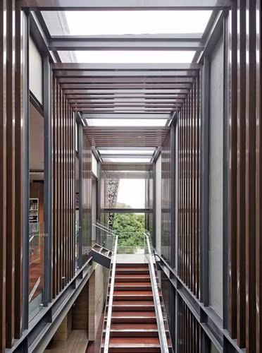 Các khung kính được thiết kế bằng gỗ và kim loại có hoa văn nổi tạo nên sự độc đáo cho ngôi nhà.