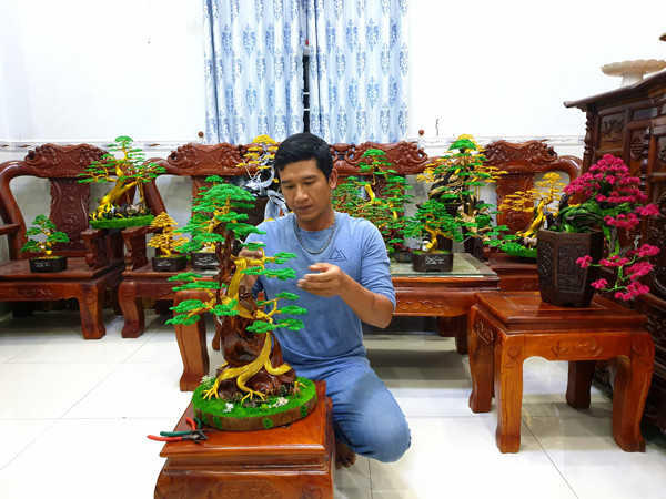 Từ việc uốn lõi dây điện, anh Đỗ Nhật Tiến, trú tại Xuân Phú (Xuân Lộc, Đồng Nai) đã sáng tạo những cây cảnh bonsai làm từ nguyên liệu này.