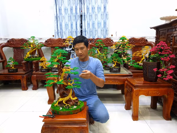Để sản phẩm của mình giống thật nhất, anh đã phải nghiên cứu rất kỹ về cây cảnh bonsai. Từ cánh hoa, chiếc lá hay thân, rễ của cây… anh đều phải tìm hiểu rất nhiều và tự tìm cách làm sao cho giống thật. Đặc biệt, cách uốn thân và cành cần phải có độ mềm mại nhất định.