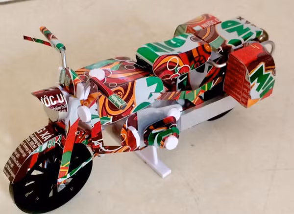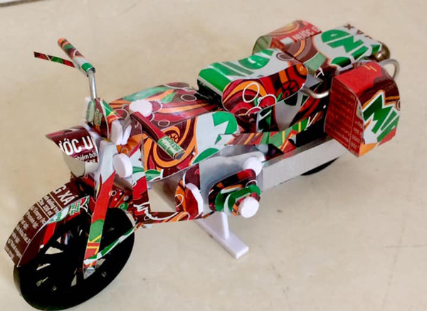 Một số sản phẩm anh Trí làm ra như: xe máy, đàn piano, đàn ghi-ta, máy bay... Mỗi sản phẩm anh bán với giá dao động từ 90.000 -300.000 đồng, tùy kích thước và công sức bỏ ra.