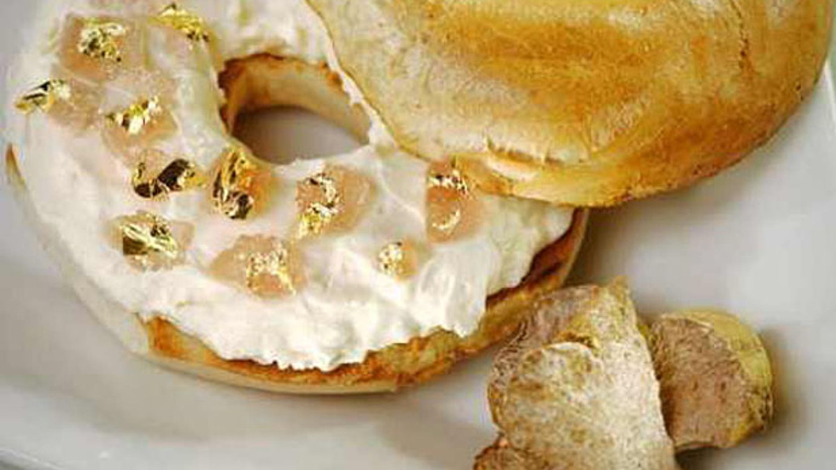 Món bánh mì tròn yêu thích của bạn là gì? Kem phô mai? Một đầu bếp ở New York đã quyết định đẩy mạnh giá của chiếc bánh mì tròn trong bữa tiệc Năm mới năm nay bằng cách thêm pho mát kem truffle trắng, thạch Riesling tẩm goji berry và phủ vàng lá khiến nó trở thành món bánh mì tròn đắt nhất thế. Giá của mỗi chiếc bánh nhỏ bé này tới 1.000 USD.
