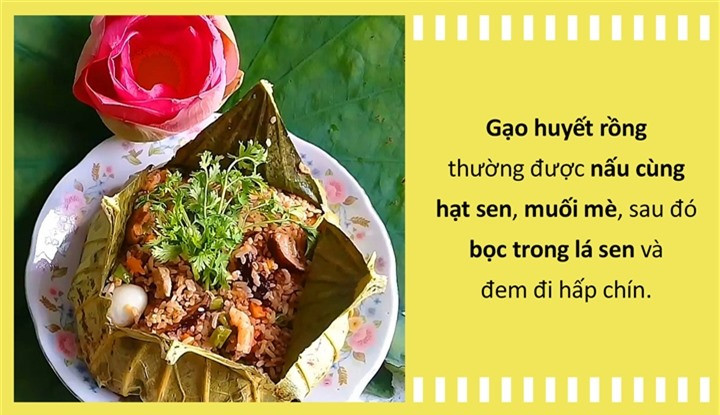 Đến Đồng Tháp, du khách sẽ được thưởng thức nhiều món ngon từ cơm gạo huyết rồng. Thông thường, người ta sẽ trộn cơm với một số nguyên liệu khác để thành món đặc sản. Cụ thể, gạo sau khi ngâm nước sẽ được trộn với hạt sen, muối mè sau đó bọc trong lá sen và hấp chín. Khi chín, hạt cơm, lá sen trộn lẫn vào nhau, tạo thành một mẻ cơm màu sắc bắt mắt, khi ăn có vị ngọt, béo của cơm, vị bùi, thơm mùi sen phảng phất của hạt sen và lá sen.