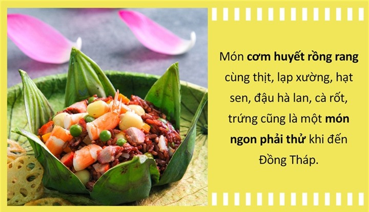 Cơm huyết rồng đã trở thành món đặc sản thể hiện được nét tinh tế trong ẩm thực của người dân Đồng Tháp. Nếu có dịp đến Đồng Tháp Mười, bạn đừng quên thưởng thức món ăn có cái tên đậm chất “kiếm hiệp” này nhé!