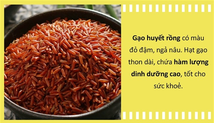 Từ cái tên có thể dễ dàng đoán ra được loại gạo này có màu đỏ đậm cả vỏ lẫn bên trong rất đặc biệt. Hạt gạo thon dài, có độ trong nhất định. Đây được coi là giống gạo từ lúa huyết rồng - giống lúa mọc trong vùng đất ngập lũ, nhiễm phèn ở lưu vực đồng bằng sông Cửu Long. Không chỉ đẹp mắt, gạo huyết rồng chứa hàm lượng dinh dưỡng cao, tốt cho sức khoẻ, đầy đủ tinh bột, chất đạm, chất xơ, vitamin (B1, B2, B3, B5, B6…), các nguyên tố vi lượng (canxi, sắt, magie, kali…).