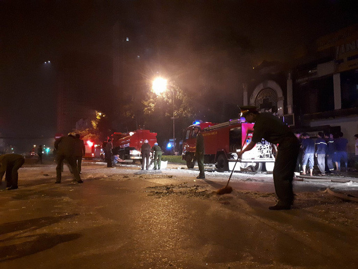 Lực lượng PCCC Công an Nghệ An đưa 5 xe chữa cháy cùng lực lượng cứu hộ đến hiện trường. Khung cảnh khá hoảng loạn, khói đang bốc ra từ tòa nhà. Đến 1h45 tại hiện trường vụ nổ có mưa lớn khiến công tác khắc phục, dọn dẹp gặp khó khăn