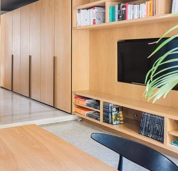 Để có được 2 yếu tố này, chủ nhà sắp xếp không gian riêng tư và chung sau đó bố trí quanh một vách tường ở trung tâm căn nhà. Không gian mở nhưng vẫn đảm bảo được sự riêng tư thông qua loạt cửa kính mờ gấp ở phòng ngủ. Những cửa kính gấp này có thể hút ánh sáng ban ngày từ cửa sổ vào căn hộ giúp tăng độ sáng.