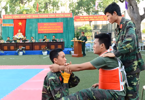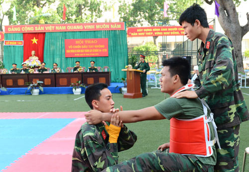 Với tinh thần “Khỏe để xây dựng và bảo vệ Tổ quốc”, đánh địch trong mọi tình huống, kể cả tay không, Lữ đoàn 144-Bộ Tổng Tham mưu đã tổ chức Hội thao võ chiến đấu tay không chào mừng 63 năm ngày truyền thống đơn vị. Trong ảnh, cú ra đòn của vận động viên đai đỏ.