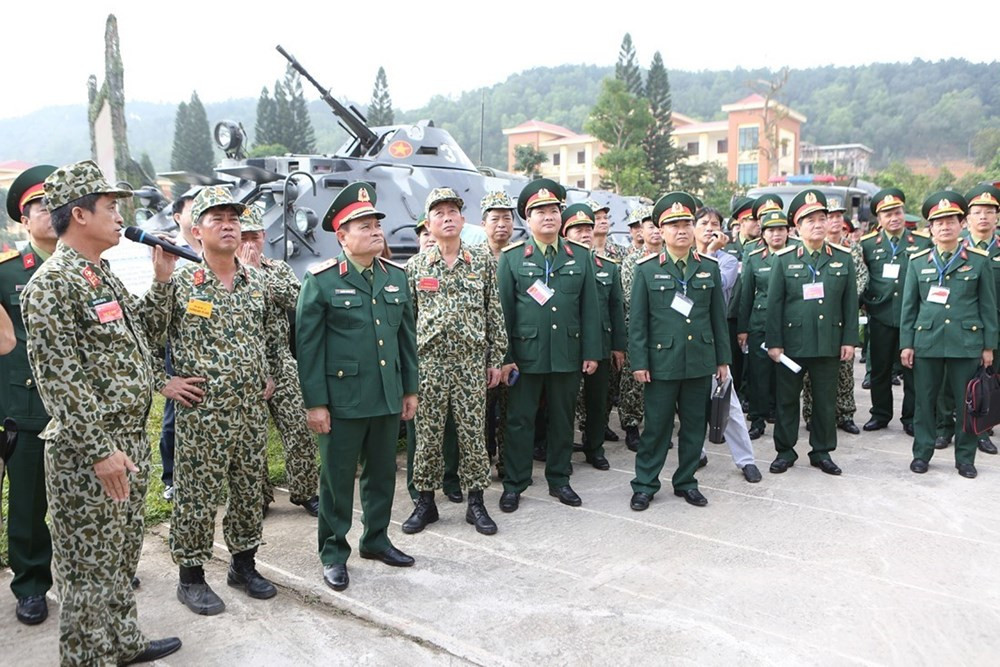 Thượng tướng Nguyễn Phương Nam, Phó Tổng Tham mưu trưởng Quân đội Nhân dân Việt Nam và các đại biểu tham quan trang thiết bị, vũ khí của lực lượng Đặc công. (Ảnh: Dương Giang/TTXVN)