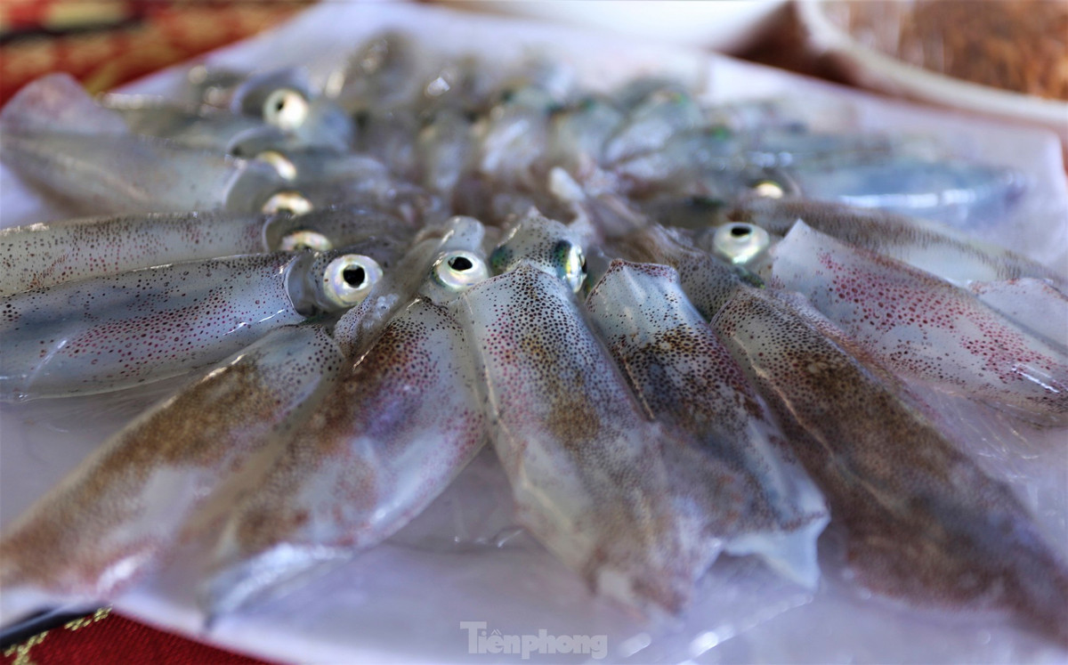 Những con mực tươi sống được người dân lành nghề đi câu trong đêm, thả nuôi vào khoang thuyền có trữ sẵn nước biển rồi đem về bán cho các chủ nhà hàng nổi kinh doanh hải sản ở bên bờ biển thuộc địa bàn thôn Hải Phong, xã Kỳ Lợi.